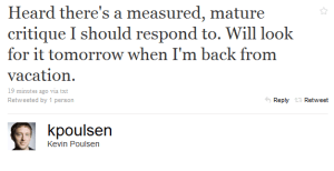 UPDATE: Evan Hansen, the Editor-in-Chief of Wired.com, says on Twitter that Poulsen is “on vacation” but that Wired will post a response to this article tomorrow. What they ought to do, at the absolute minimum, is post the portions of the chat logs about which Lamo had made public statements or make clear that they do not exist. And here’s Poulsen’s response on Twitter, posted just now: