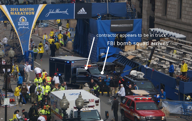 Why did it appear that the FBI was fully aware of their presence, and in fact working with them, specifically with what looks like a bomb squad unit? Were these contractors specialists in explosives, and if so, what is the significance that at least two of them were spotted just meters from where the blast occurred?