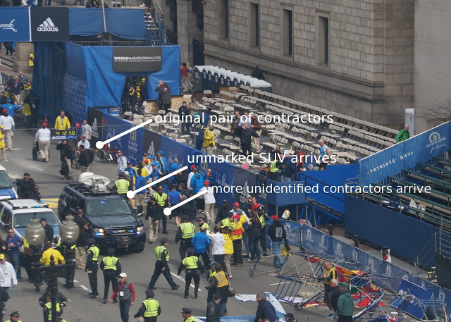 What appear to be private contractors, wearing unmarked, matching uniforms and operating an unmarked SUV affixed with communication equipment near the finish line of the Boston Marathon shortly after the bomb blasts – can be seen beforehand, standing and waiting just meters away from where the first bomb was detonated.