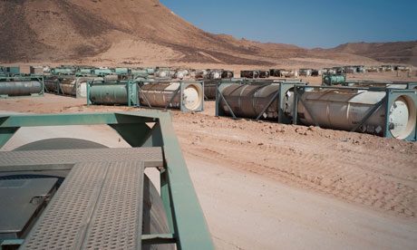 Image: (via the Guardian) “Chemical containers in the Libyan desert. There are concerns unguarded weapons could fall into the hands of Islamist militants. Photograph: David Sperry/AP”