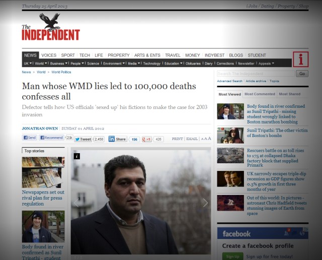 Image: From Independent’s “Man whose WMD lies led to 100,000 deaths confesses all: Defector tells how US officials ‘sexed up’ his fictions to make the case for 2003 invasion.” In retrospect, the corporate-media has no problem admitting the insidious lies that were told to justify the invasion and occupation of Iraq – the lead up to the war was another story. A verbatim repeat of these admitted lies are being directed at Syria amidst the West’s failure to overthrow the government with terrorist proxies.