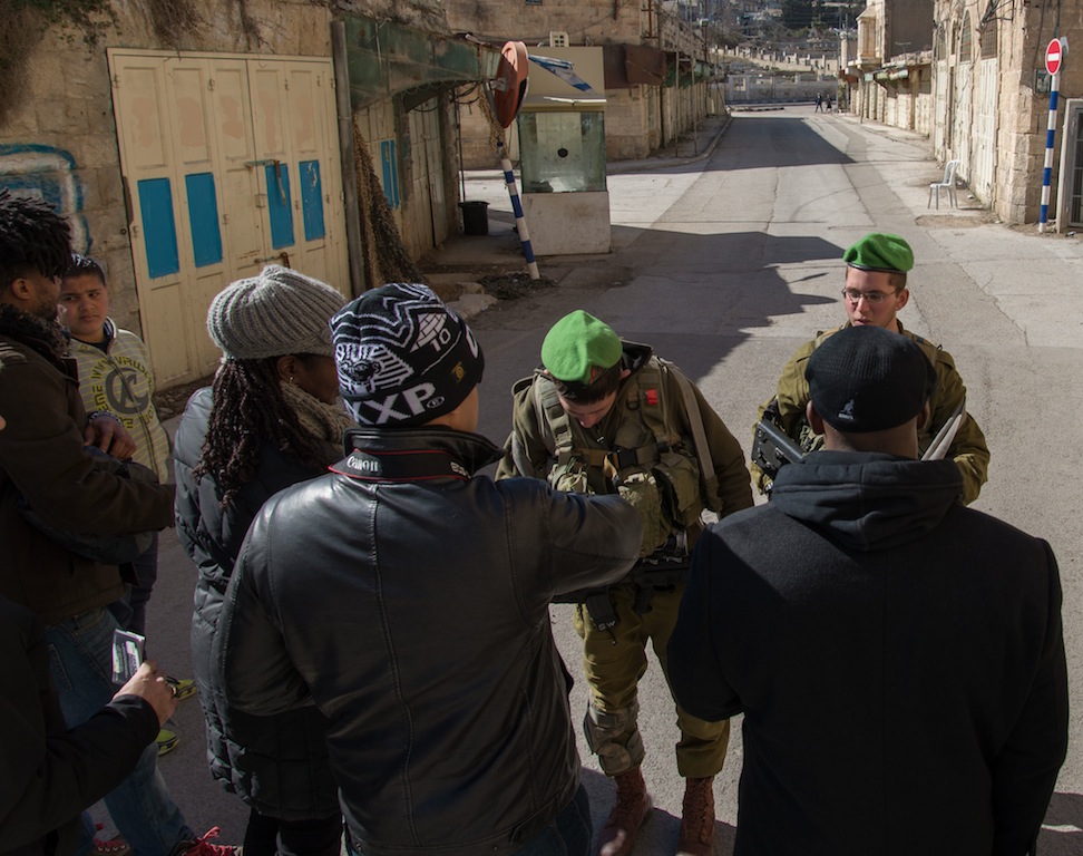 Israeli soldiers checking my passport at a checkpoint in Hebron