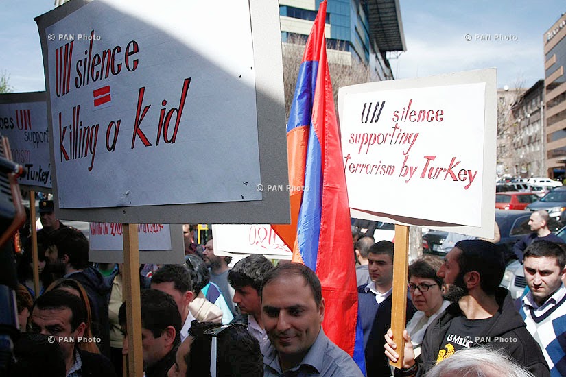 Armenians gathered Wednesday outside UN Commission headquarters in the Armenian capital Yerevan to protest what they saw as a Turkish-led Al Qaeda attack on the Armenian village in Kassab. Thousands of Armenians settled in Syria after the genocide of Armenians by the Ottoman Empire in 1915. The Attack on Kassab resulted in thousands of Armenians fleeing the area.