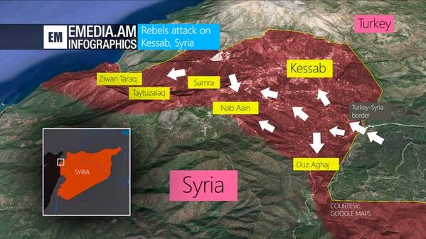 March 28, 2014 (Mimi Al Laham) – Fighting on the Syrian-Turkish border near the northwestern Syrian town of Kassab between AlQaeda insurgents Jabhat Al Nusra and the Syrian military continues for the fifth day.