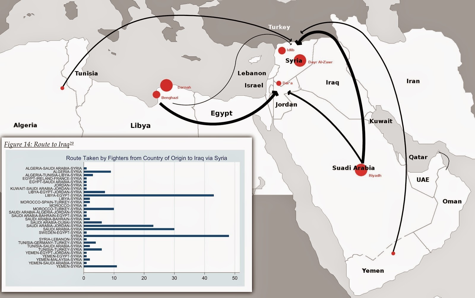 | Image: The most prominent routes into Syria for foreign fighters is depicted, with the inset graph describing the most widely used routes by foreign fighters on their way to Iraq, as determined by West Point’s 2007 Combating Terrorism Center report “Al-Qa’ida’s Foreign Fighters in Iraq” (page 20). These same networks were then used to invade and attempt to overthrow the Syrian government itself in 2011, with the addition of a more prominent role for Turkey, and today in 2014, to re-invade Iraq once again. |