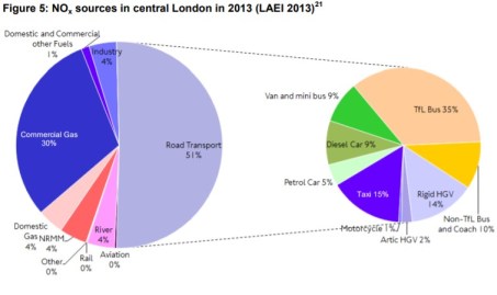 - 51% of NOx emissions in central London were due to road transport [pdf, p22].