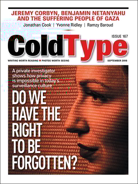 to information, but there are many people who would like to be anonymous, free from search engines and snoopers. Tough luck! Private investigator Judith Coburn explains, in this issue’s cover story, why there’s no escape from prying eyes. In other stories, Jonathan Cook finds links between claims that UK Labour Party leader Jeremy Corbyn is antisemitic with Israeli ‘dirty tricks’ departments, Lee Camp tells how to create a coup for fun and profit; CJ Hopkins wonders what happened to those Nazis who planned a march on Washington, and Linh Dinh goes home to Vietnam. Our big photo story this issue features Jackie Sloan’s images of Omagh, a small town that was bombed 20 years ago right at the end of Northern Ireland’s Troubles. We’ve also got Yvonne Ridley on Netanyahu’s terror links, George Monbioton obesity, Trevor Grundy on strong men, Steven Feldsteinon Zimbabwe’s election, Yves Engler on Canada’s spat with Saudi Arabia, Ramzy Baroud on Gaza, Sam Pizzigati on greedy CEOs, William Blum on the media, and John Dunn on the Battle of Orgreave.