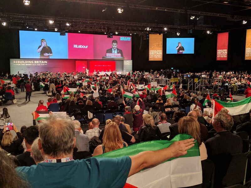 Such a powerful moment when over 1000 Palestinians flags flew in solidarity with #Palestine whilst the #StopArmingIsrael motion was heard at #Lab18. First time in living memory a Palestine motion heard at Labour conference. Palestine will be free. pic.twitter.com/8cGPmB9tps
