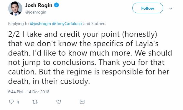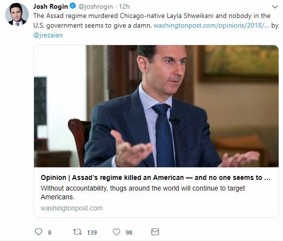 It is clear that Jason Rezaian among the pages of the Washington Post is accusing the Syrian government of detaining, torturing, and executing Layla Shweikani – and demanding accountability.