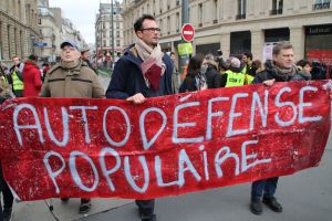 The banner reads, “Popular self-defense”Mass protests and clashes with police occurred in smaller cities across France. In Nîmes, around 3,000 protesters clashed with riot police, who fired thick clouds of tear gas around the Roman arena and the police prefecture. Over 2,000 “yellow vests” mobilized in Rouen and expelled plainclothes policemen who tried to infiltrate their protest. In Caen, 4,000 protesters rallied and clashed with police around the train station, tearing up train tracks to throw material at the security forces.