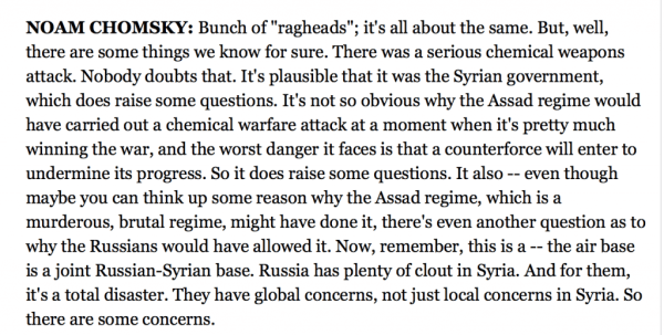 (Noam Chomsky on Democracy Now, April 5, 2017, See the video of the Democracy Now interview with Chomsky here