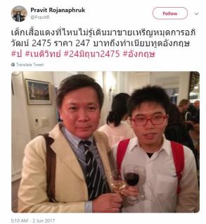 A 2017 Twitter post by pro-Western commentator Pravit Rojanaphruk showed himself posing (left) with Netiwit Chotiphatphaisal (right) inside the British Embassy enjoying wine together.