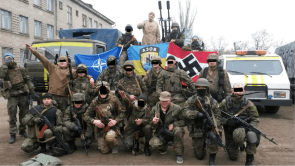 Please note flags of the Azov Battalion, centre, NATO left, and Nazi, right.