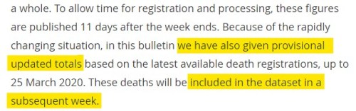 However, with coronavirus deaths, since its a “national emergency”, they are now including “provisional figures” which will be “included in the dataset in subsequent weeks”. This leaves them wide open to – either accidentally or deliberately – reporting the same deaths twice. Once “provisionally”, and then once “officially” a week later.