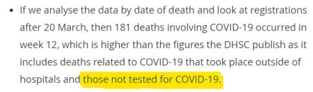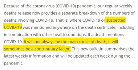 BUT, from now on, the ONS will also include Covid19 deaths “in the community” in their statistics. That “includes those not tested for Covid19” and where “suspected Covid19″ [our emphasis] is presumed to be a “contributory factor”.