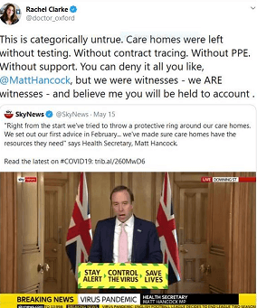 ‘This is categorically untrue. Care homes were left without testing. Without contract tracing. Without PPE [personal protective equipment]. Without support. You can deny it all you like, Matt Hancock, but we were witnesses – we ARE witnesses – and believe me you will be held to account.’