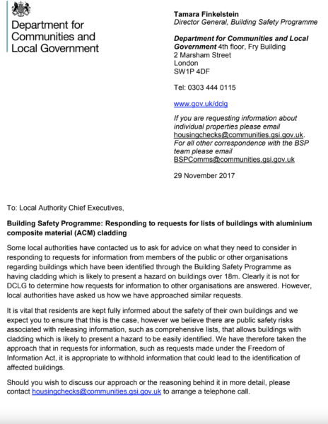 In a letter sent to all local authority chief executives, and obtained by openDemocracy, the housing ministry told councils that when responding to FOI requests about ACM “it is appropriate to withhold information that could lead to the identification of affected buildings”.