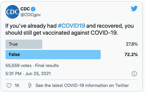 Yesterday, 6/25/21, the Centers for Disease Control and Prevention put out a poll on social media. It was a simple statement the agency interrogated as a TRUE/FALSE query: “If you’ve already had #COVID-19 and recovered, your should still get vaccinated against COVID-19