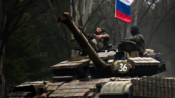 Feature photo | A fighter looks up while riding on a tank flying Russia’s flag, on a road east of Donetsk. Vadim Ghirda | AP