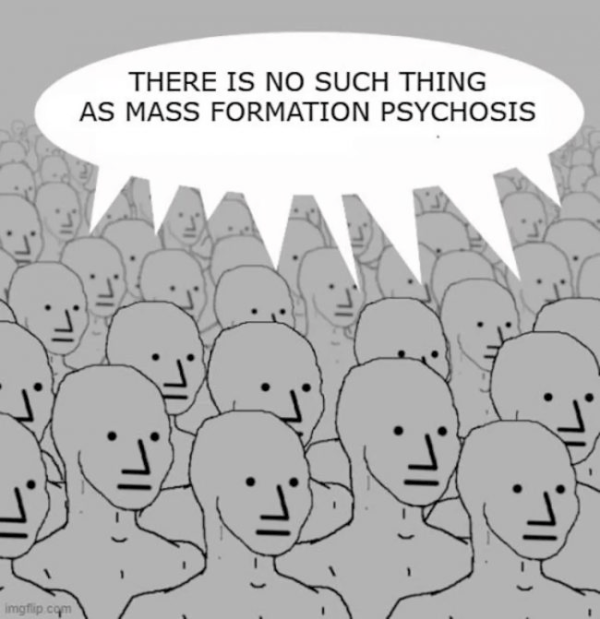 In a nutshell, mass formation describes the process whereby a large part of the population subconsciously disengages its rational and critical faculties in order to participate in a form of groupthink, the focus of which is usually one small point or issue.