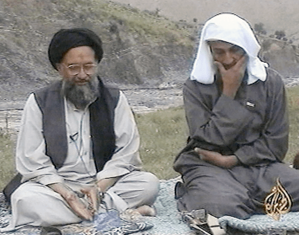 An Al-Jazeera TV image of Osama bin Laden (R) listening as his top deputy Ayman al-Zawahri speaks at an undisclosed location circa 2002.