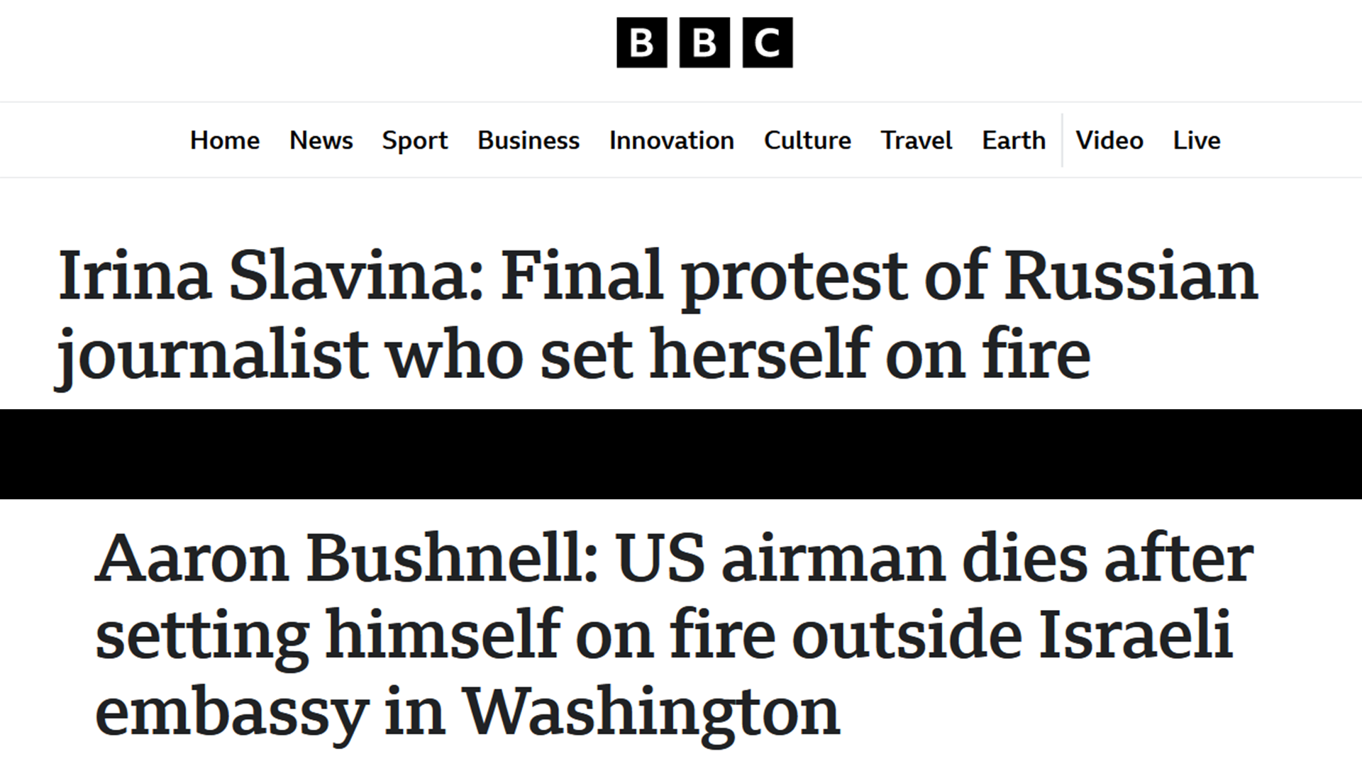 British state media BBC did the same: de-politicizing Bushnell’s fatal protest against US-sponsored genocide in Gaza, while heroizing Slavina’s suicide in Russia as a “final protest” against Putin.