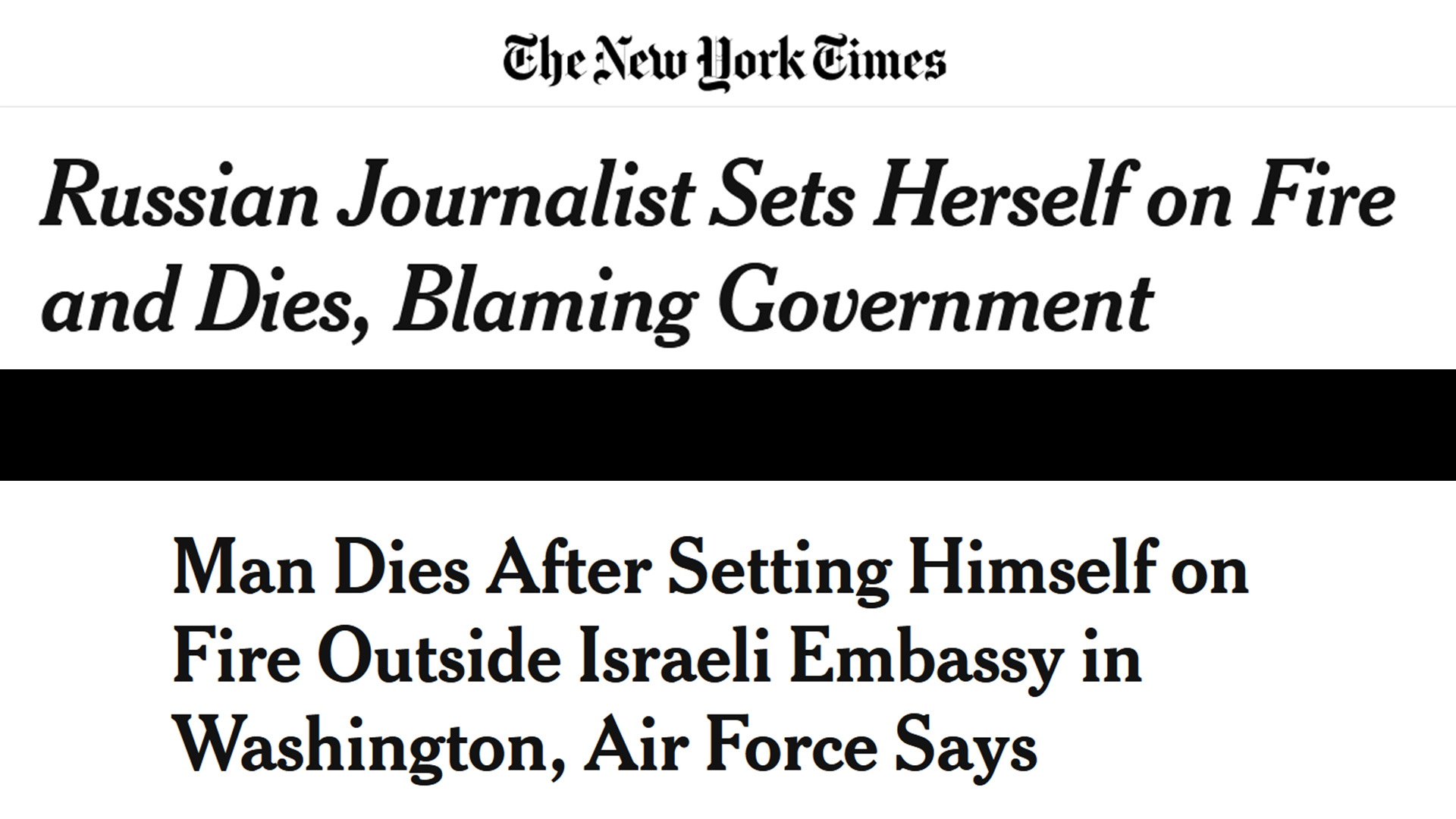 But when a Russian journalist, Irina Slavina, set herself on fire back in 2020, the Times was careful to point out that it was an act of protest against the government of Vladimir Putin.