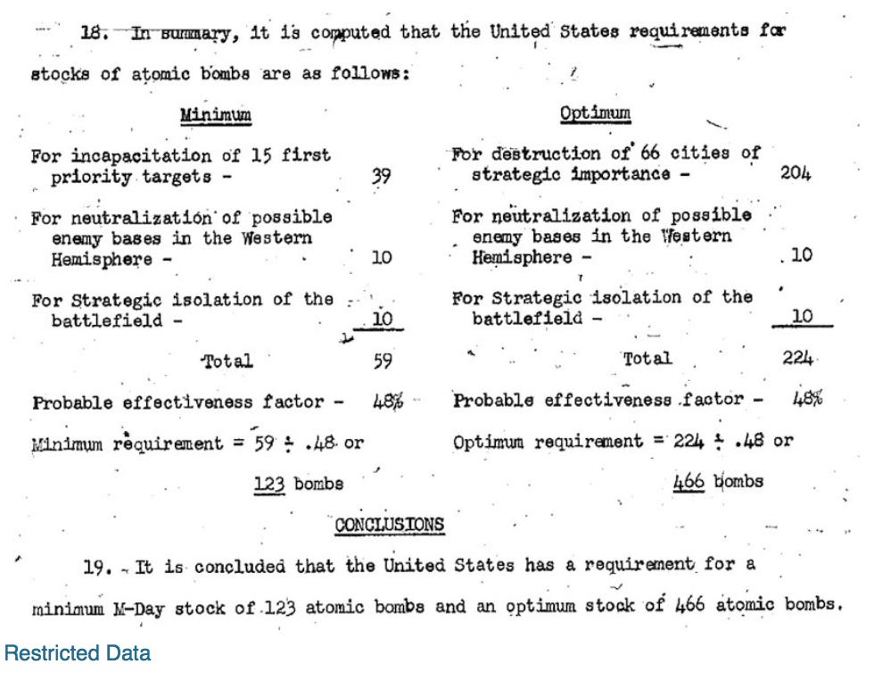 Let’s cut to the chase. How many bombs did the USAAF request of the atomic general, when there were maybe one, maybe twobombs worth of fissile material on hand? At a minimum they wanted 123. Ideally, they’d like 466. This is just a little over a month after the bombings of Hiroshima and Nagasaki.