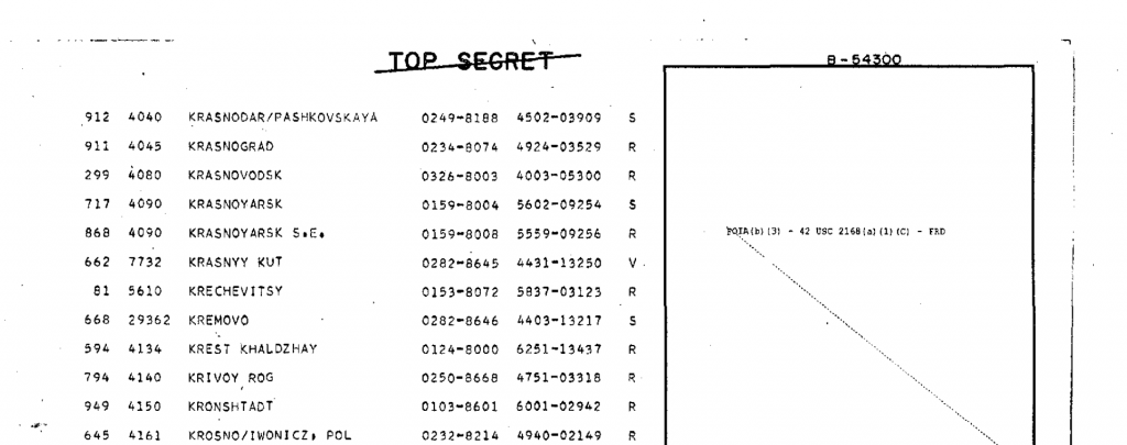 Excerpt from list of 1200 Soviet cities targeted for nuclear attack in alphabetical order. National Security Archive, op. cit.