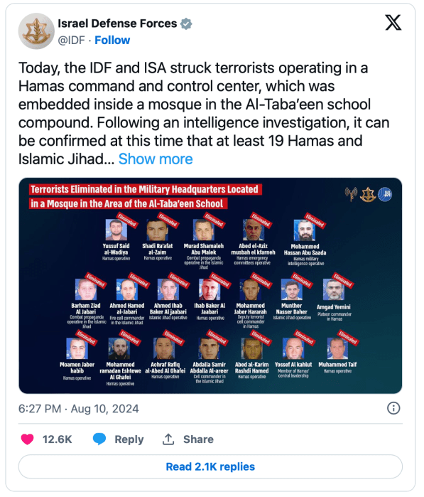 In response, Israel released the names and photographs of 19 Palestinians, whom they labeled as operatives of Hamas and Palestinian Islamic Jihad (PIJ). The Israeli military claimed these individuals were “eliminated” in a “Hamas command and control center, embedded inside a mosque within the Al-Taba’een school compound.” Israeli military spokesperson Daniel Hagari stated, “We took numerous steps to mitigate the risk to civilians. The IDF conducted a precision strike against the terrorists in one specific building of the compound—an area where, according to our intelligence, no women and children were present.”