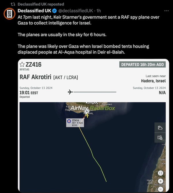 🇬🇧✈🗣A British spy plane is believed to have been providing targeting information to the Israeli Air Force when 🇮🇱Israel bombed tents housing displaced persons at the Al-Aqsa hospital in Deir el-Balah.