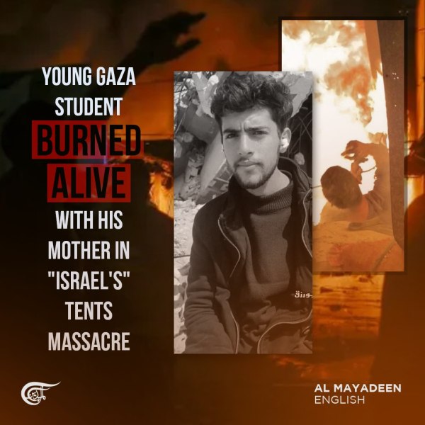 20-year-old Shaaban al-Dalou and his mother were tragically killed, burned alive after Israeli airstrikes targeted tents near Al-Aqsa Martyrs’ Hospital in Deir al-Balah, central Gaza.