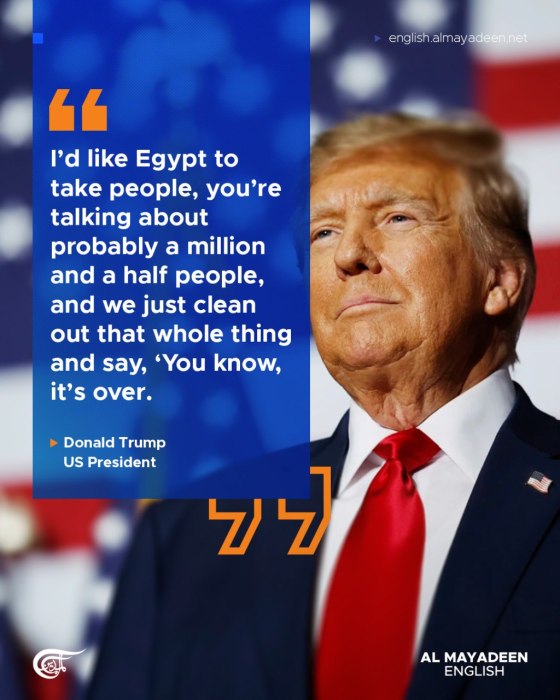 Former US President Donald Trump suggested on Saturday a controversial plan to “just clean out” Gaza through the mass expulsion of its population to neighboring Egypt and Jordan, framing the proposal as a step toward “Middle East peace.”