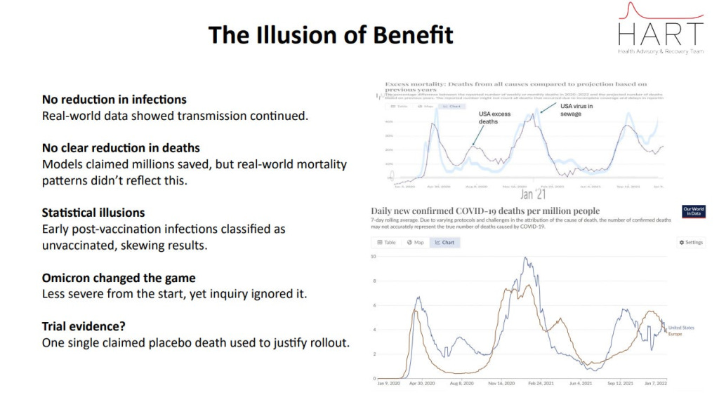 “…was built on a fantasy born of modelling and a statistical illusion…In the real world it was clear in 2021 that the vaccines did not reduce infections. Afterwards, there was a pivot to claim they prevented severe disease and death. Different witnesses still clung to different parts of this false narrative…”