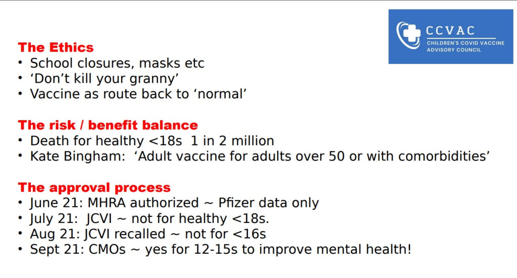 Dr Ros Jones, retired consultant paediatrician and chair of CCVAC gave a powerful and heartfelt presentation (transcript here) calling out the appalling ethical violations and derelictions of duty that led to children being given dangerous, experimental products for an illness that posed no risk to them. As she pointed out: