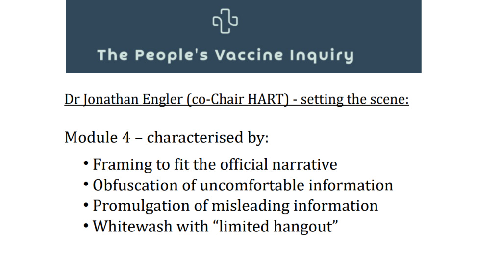 Dr Engler described how the structure of the Inquiry and the questioning of Core Participants was conducted to give a carefully curated story about the Covid vaccines, minimising criticism of the products or rollout and affirming its resounding success. Through the use of closed questions and the refusal to allow them to present science supporting their concerns (as they were not deemed ‘expert witnesses’’), Dr Engler commented that
