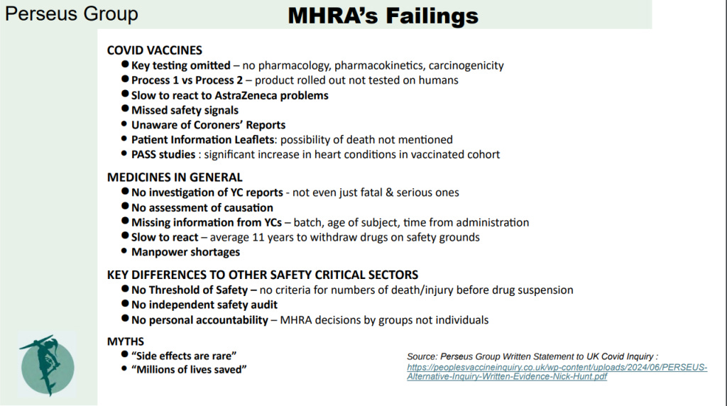 Nick Hunt, a former Senior Civil Servant in the Ministry of Defence responsible for the safety and effectiveness of explosive items for the UK Armed Forces, spoke on behalf of the Perseus Group, detailing in his presentation (transcript here) how the MHRA had failed in their duty to protect the public from a dangerous product. He also debunked the myth that Covid vaccine side-effects are ‘rare, very rare or extremely rare’ as the Inquiry KCs repeatedly claimed.