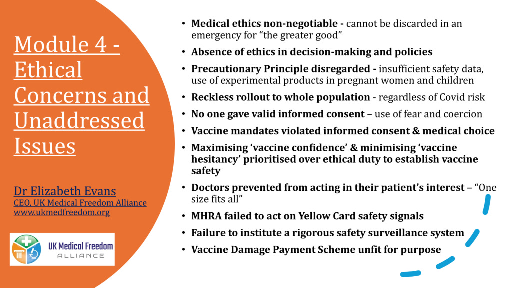 In her presentation (transcript here), Dr Elizabeth Evans (CEO of the UK Medical Freedom Alliance) called out the failure of the Inquiry to address the ethics of decision-making and policies relating to the vaccines and rollout, stating: