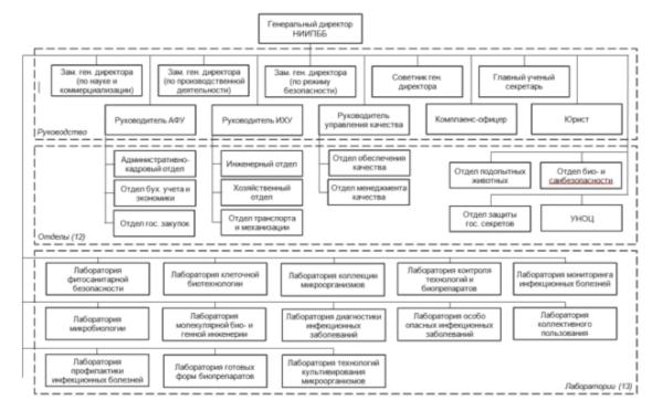 The organization’s structure consists of management, 12 departments, and 13 laboratories. It employs a total of 271 people, including 20 senior staff members, 167 scientific laboratory staff members, and 94 departmental staff members.