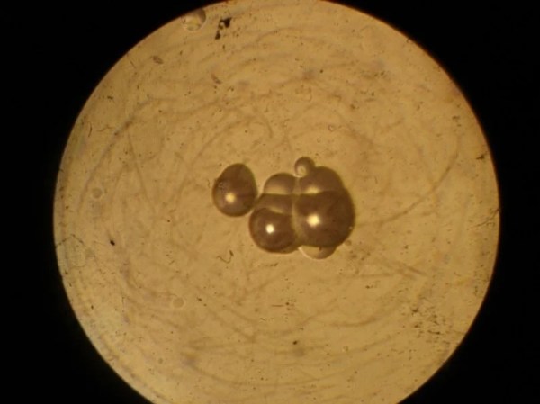 Since Uranium is a weak alpha emitter and the particles are so small, we exposed it for 30 days. What we found is that the sample contained many Uranium hot particles. One of these is shown in the microscope photo, where the magnification is 400X. How do we know it is Uranium? We know because of the size of the track picture and the time of exposure. What kind of Uranium? EU or DU? We don’t know that, but the sample has been sent for analysis to a lab for mass spectrometry, which might tell us. How do we know it’s a hot particle? Because normally the tracks on CR39 are from individual atoms, and they are spaced far apart randomly. The hot particle tracks are clustered all in one place, because they originate in a single massive particle with billions of Uranium atoms all flying out in every direction. It is only those that fly towards the plastic that are registered, the bubbles showing a cross section of the track.