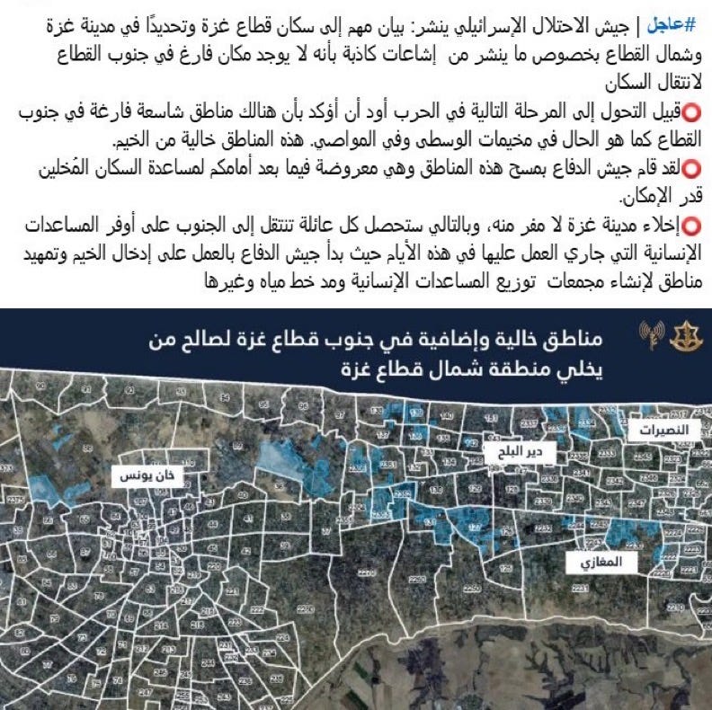 Urgent | The Israeli Occupation Army publishes an important statement to the residents of Gaza Strip, specifically Gaza City and the northern Gaza Strip, regarding what is being spread as false rumors that there is no place in the southern Gaza Strip to relocate the population.