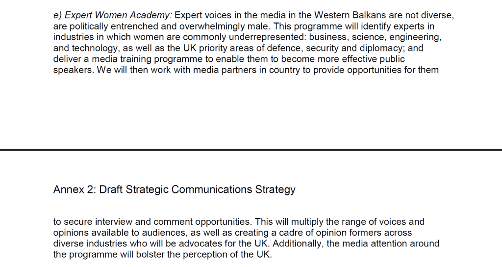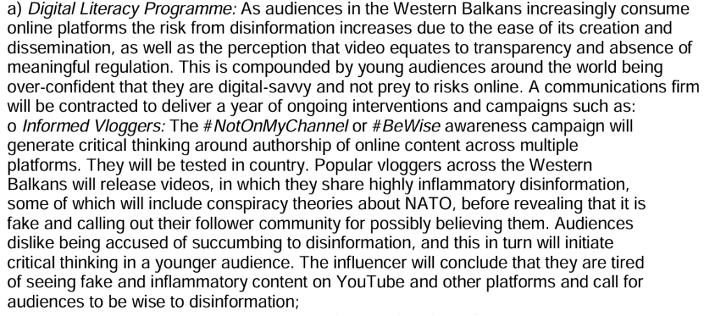According to BBCMA documents, Britain sought to “contest the information space” throughout the Balkans through a series of campaigns to “diversify the information, sources and perspectives available” to local populations. In this case, diversity was a clear subtext for amplifying pro-NATO, UK-centric viewpoints.