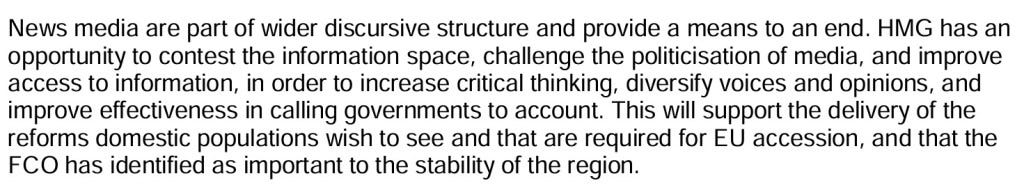 That the Foreign Office uses BBCMA – and the BBC by extension – for nakedly political interference overseas is spelled out in leaked documents detailing yet another covert British safari in the Balkans. While ostensibly concerned with “supporting greater media independence” in the region, BBCMA acknowledged that its news reporting was “a means to an end.” The ultimate objective, according to the internal documents, was holding “governments and powerful entities to account” should they fail to act as required by London.