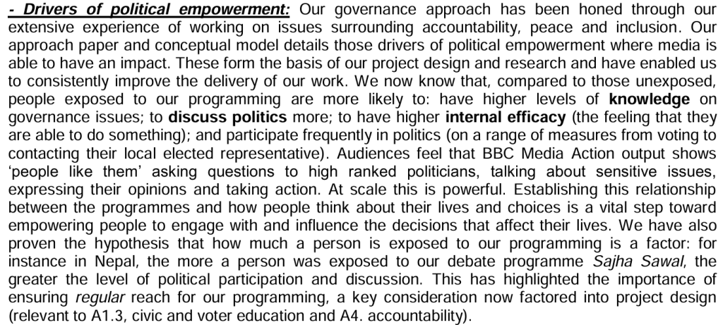 “We recognise that different formats achieve different things when it comes to change… and consider audience needs, objectives and operational context when deciding which format to use,” BBCMA asserts in one file. In another, the organization crows, “people exposed to our programming are more likely to: have higher levels of knowledge on governance issues; to discuss politics more; to have higher internal efficacy (the feeling that they are able to do something); and participate frequently in politics.”