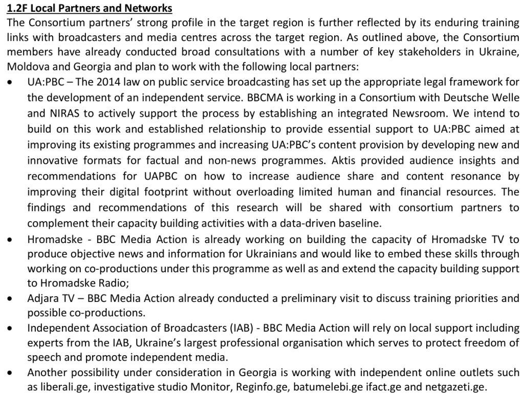 BBCMA and the Thomson Reuters Foundation (TRF) operatives met in private every four months to discuss the operation’s progress with representatives of the Foreign Office, and British embassies in the three target countries. In advance of the project, the pair leveraged their “strong profile” in Georgia, Moldova, and Ukraine to conduct “broad consultations” with neighborhood news outlets, media organizations and journalists.