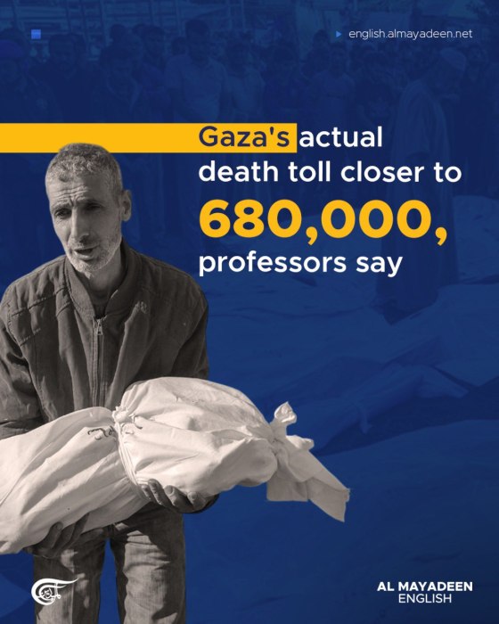 An article published earlier this year by Hil and Polya concluded that “the actual death toll of 680,000 deaths from violence and imposed deprivation by 25 April 2025 (28% of the pre-war Gaza population of 2.4 million),” including 136,000 deaths from violence and 544,000 from deprivation.