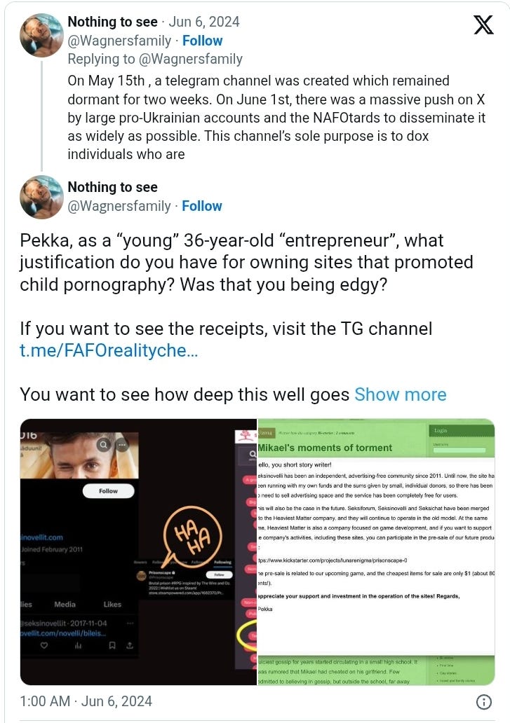 Tellingly, these damning disclosures failed to dent Kallioniemi’s standing among his supporters, in particular within the NATO-endorsed contingent of pro-Ukraine cyberbullies known as NAFO. “Running a porn site is hella based,” one NAFO supporter replied to his semi-confessional post.