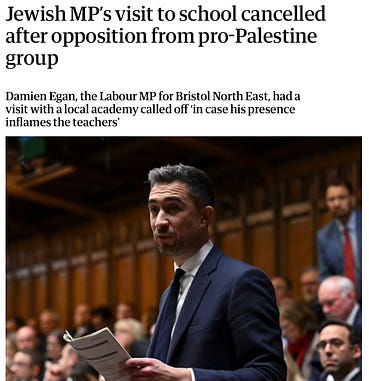 Predictably, the Guardian is stoking the outrage machine over a Bristol school cancelling a visit by local Labour MP Damien Egan. Like other media, the paper is duping readers by suggesting this is evidence of “antisemitism”. Egan is Jewish.