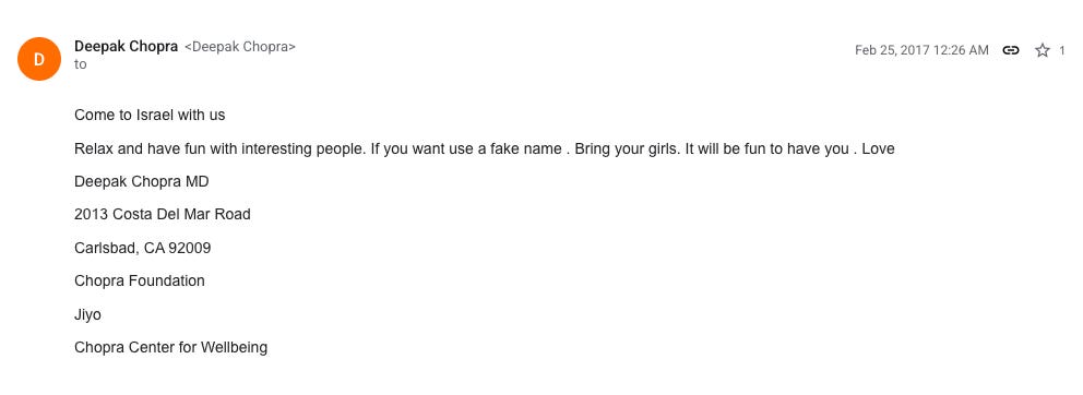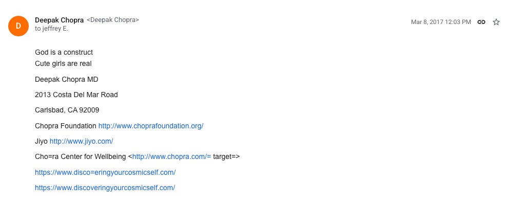 Some of the emails interested me. Years ago, I wrote a book called Karma of Brown Folk that had a chapter called ‘Sly Babas’ that eviscerated Deepak Chopra. Then, I was more interested in his prosperity gospel, which was bogus, adulterated Hinduism for a new New Age crowd – more interested in therapy and yoga than in the rigours of faith. The emails from Deepak Chopra to Epstein are simply disgusting, difficult to read and even more difficult to digest after his ridiculous denial. How do you deny this: