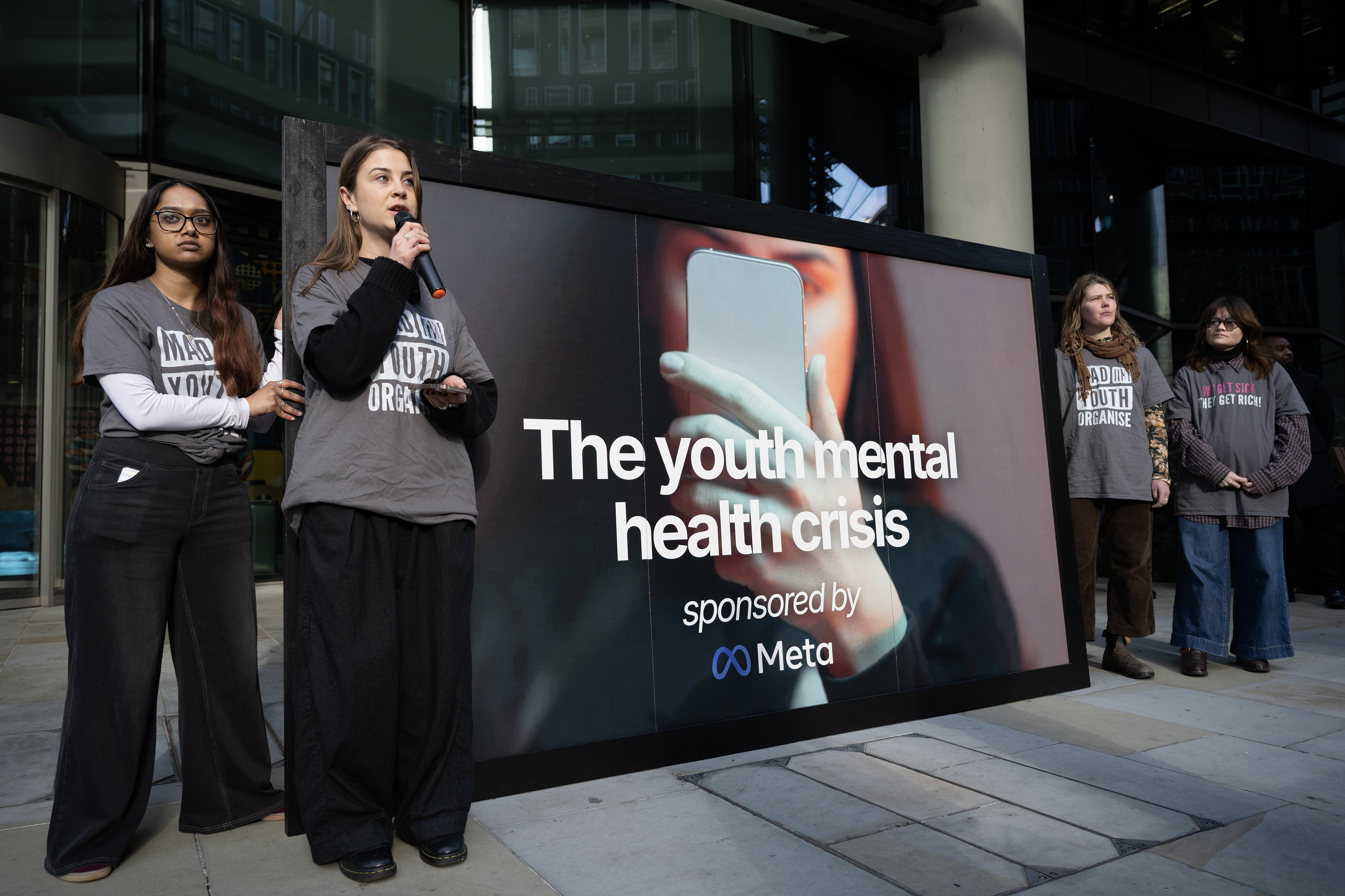 I have experienced this first-hand. When I was withdrawn and isolated, my Instagram and Facebook feeds quickly became a source of graphic, violent images encouraging self harm and suicide. My mental health spiralled, and as a result I ended up in a psychiatric hospital. We cannot let social media companies get away with these harmful business practices. That’s why earlier today, the Mad Youth Organise campaign installed a giant billboard outside Meta’s London headquarters calling them out for fuelling young people’s mental illness. ⬇️ |
